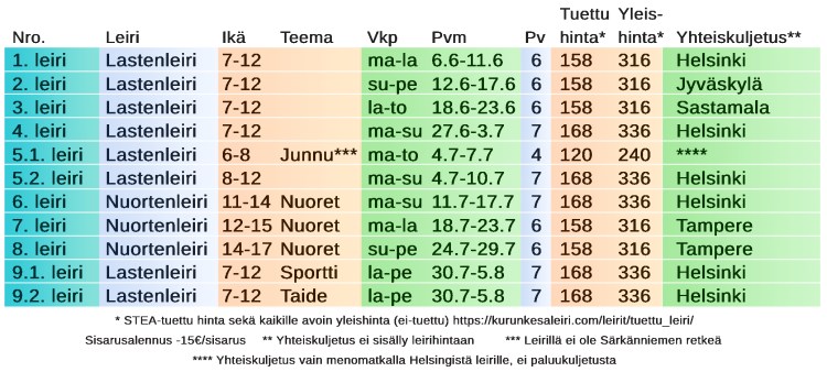 Kesällä 2022 järjestämme LASTENLEIREJÄ, ensikertalaisten JUNNULEIRIN, kolme NUORTENLEIRIÄ sekä kaksi lasten teemaleiriä: TAIDELEIRI ja SPORTTILEIRI! Tutustu erilaisiin leireihin sivulla Leiriohjelma