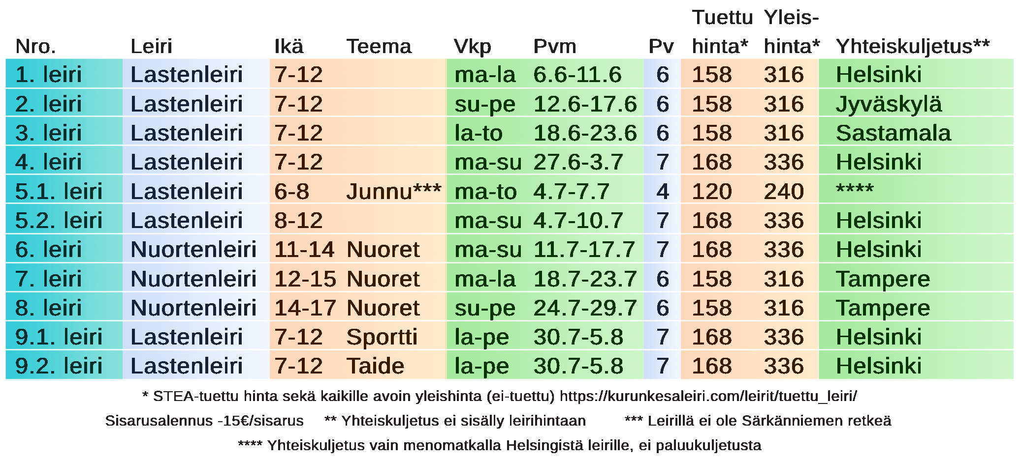 Kesällä 2022 järjestämme LASTENLEIREJÄ, ensikertalaisten JUNNULEIRIN, kolme NUORTENLEIRIÄ sekä kaksi lasten teemaleiriä: TAIDELEIRI ja SPORTTILEIRI! Tutustu erilaisiin leireihin sivulla Leiriohjelma