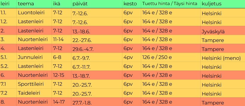 Kesän leiriaikataulu on nyt julkaistu. Ilmoittautuminen leireille alkaa 1.1.2026 klo 09.00 ja jatkuu niin kauan, kun leireillä on vielä vapaita paikkoja. Hakulomakkeeseen pääsee sivun päädystä.